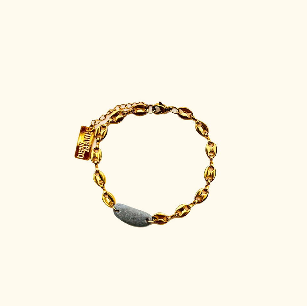 Perles de jadéite et d’hématite, galet de plage blanc montés sur un double fil rose.